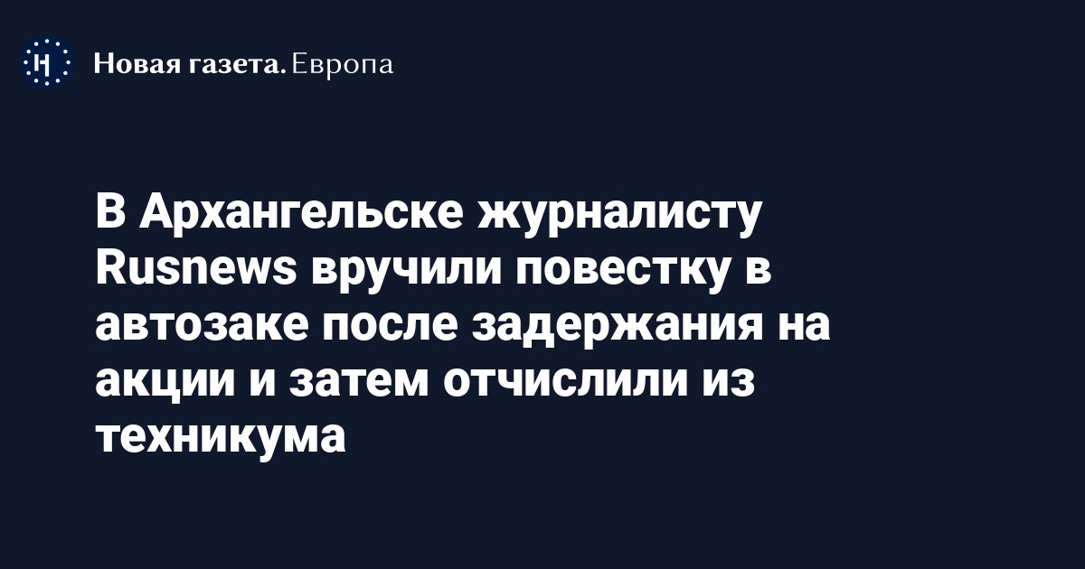 В Архангельске журналисту Rusnews Андрею Кичеву вручили повестку в автозаке после задержания на акции и затем отчислили из техникума. Об этом сообщает Rusnews со ссылкой на самого Кичева.