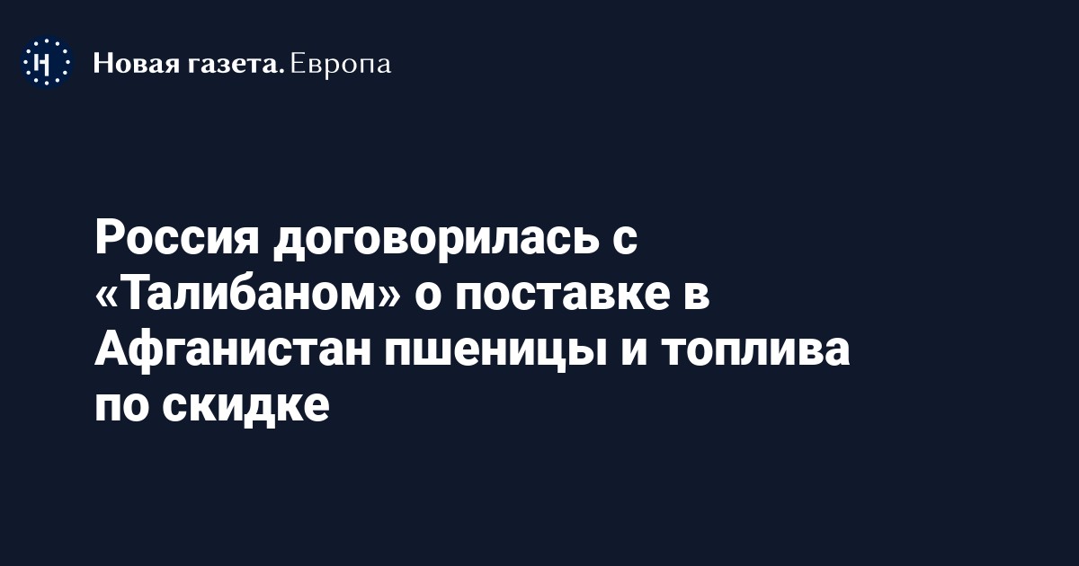 Россия заключила сделку с «Талибаном» (движение признано в России террористическим, его деятельность запрещена) о поставке в Афганистан бензина, дизельного топлива, газа и пшеницы. Об этом пишет Reuters со ссылкой на министра и. о. министра торговли и промышленности Афганистана Хаджи Нуруддина Азизи.