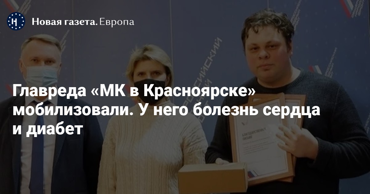 Главного редактора «МК в Красноярске» Владислава Пирогова мобилизовали, несмотря на то, что журналист не служил в армии, а также имеет заболевания — болезнь сердца и диабет. Об этом сообщила редакция издания.