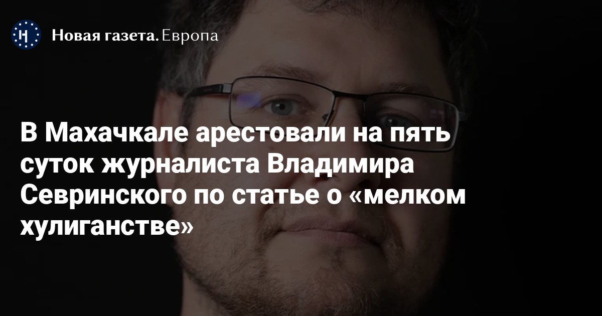 В Махачкале арестовали на пять суток журналиста Владимира Севринского по статье о «мелком хулиганстве», он работал по редзаданию «Медузы». Об этом изданию рассказал его адвокат Алексей Прянишников.