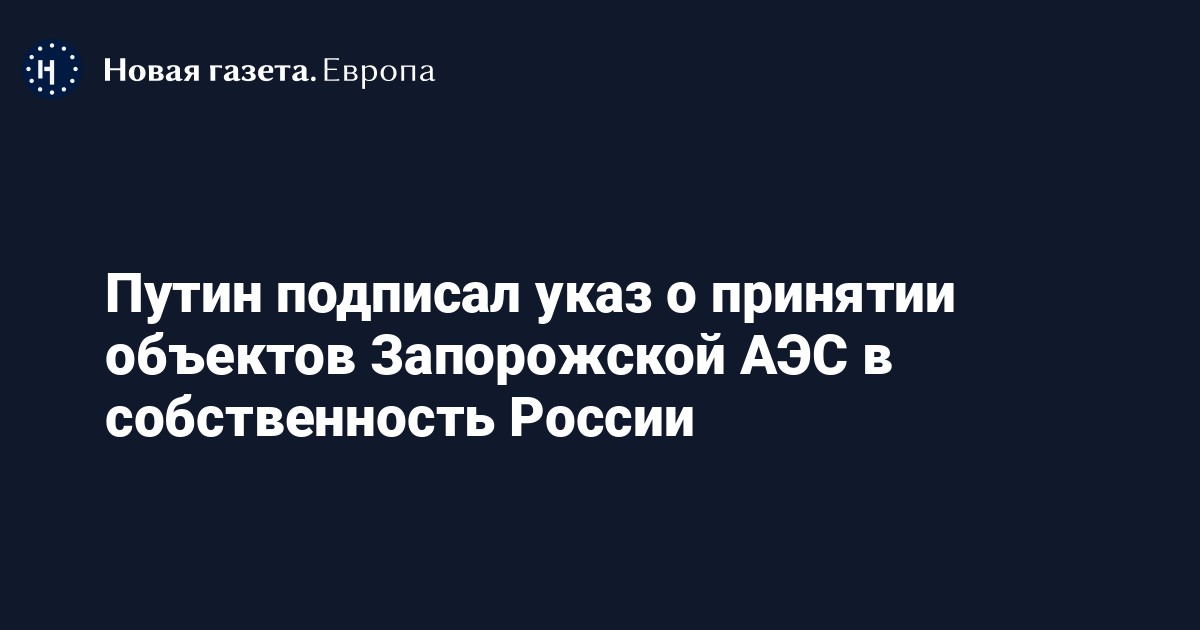 «Правительству Российской Федерации обеспечить принятие в федеральную собственность объектов использования атомной энергии Запорожской атомной электростанции и иного имущества, необходимого для осуществления ее деятельности», — сказано в указе.