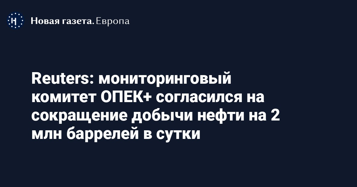 Мониторинговый комитет ОПЕК+ согласился на сокращение добычи нефти на 2 млн баррелей в сутки. Об этом сообщает Reuters со ссылкой на источники.