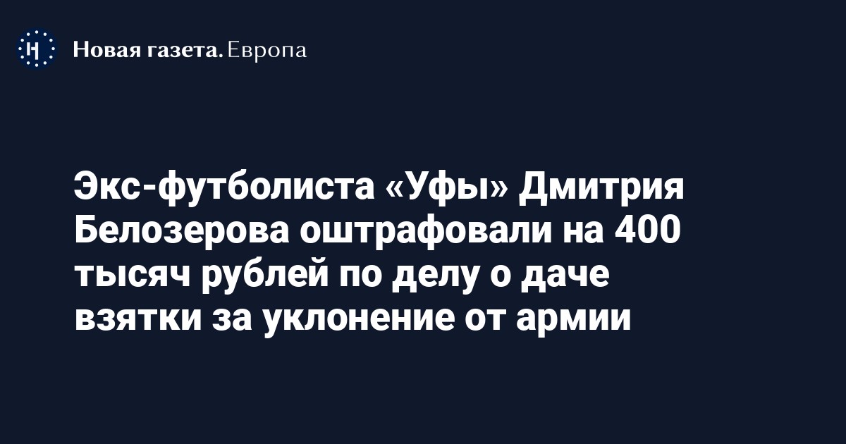 Ленинский районный суд Уфы оштрафовал на 400 тысяч рублей 23-летнего футболиста Дмитрия Белозерова, который ранее играл за молодежный состав футбольного клуба «Уфа», за взятки за уклонение от армии (ч. 3 ст. 30, п. «б» ч. 4 ст. 291 УК). Об это сообщает ТАСС со ссылкой на пресс-службу суда.