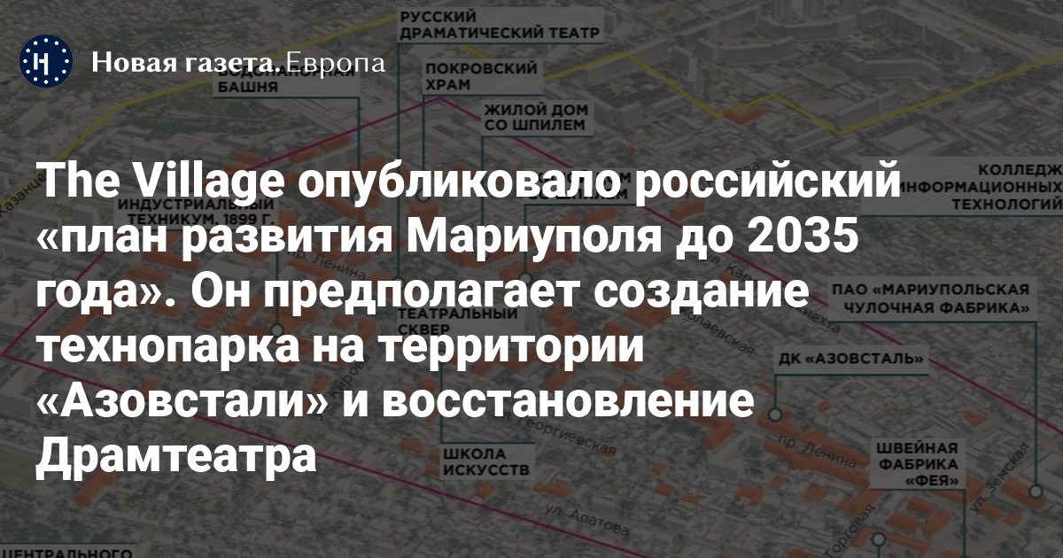 Издание The Village опубликовало российский «план развития Мариуполя до 2035 года», подготовленный Единым институтом пространственного планирования (бывший Институт Градплана Москвы) по заказу Минстроя РФ. Также документ целиком приводит «Медуза».