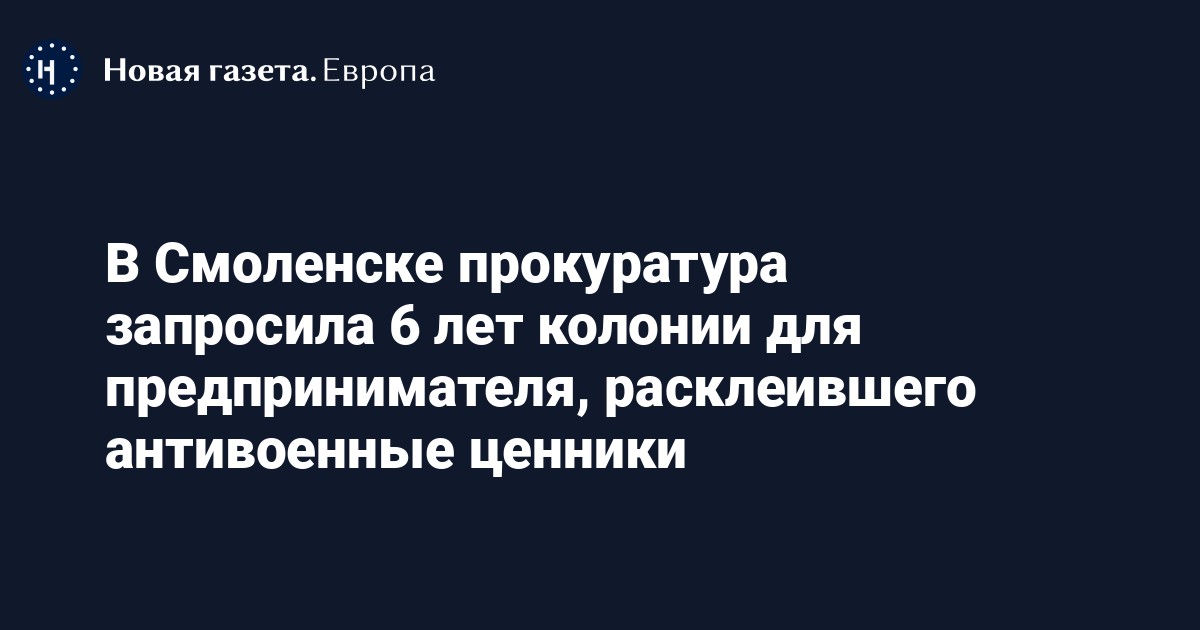 В Смоленске прокуратура запросила шесть лет колонии для местного предпринимателя Владимира Завьялова, обвиняемого по делу о «фейках» про российскую армию (ст. 207.3 УК). Об этом сообщает издание «7х7».