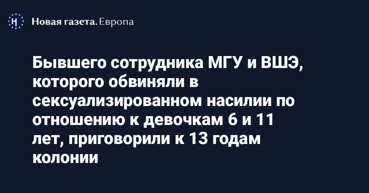 Мещанский районный суд Москвы приговорил бывшего старшего научного сотрудника ВШЭ и МГУ Евгения Золина к 13 годам колонии строгого режима по обвинению в насильственных действия сексуального характера в отношении несовершеннолетних (ч. 4 ст. 132 УК). Об этом сообщает ТАСС со ссылкой на пресс-службу суда.