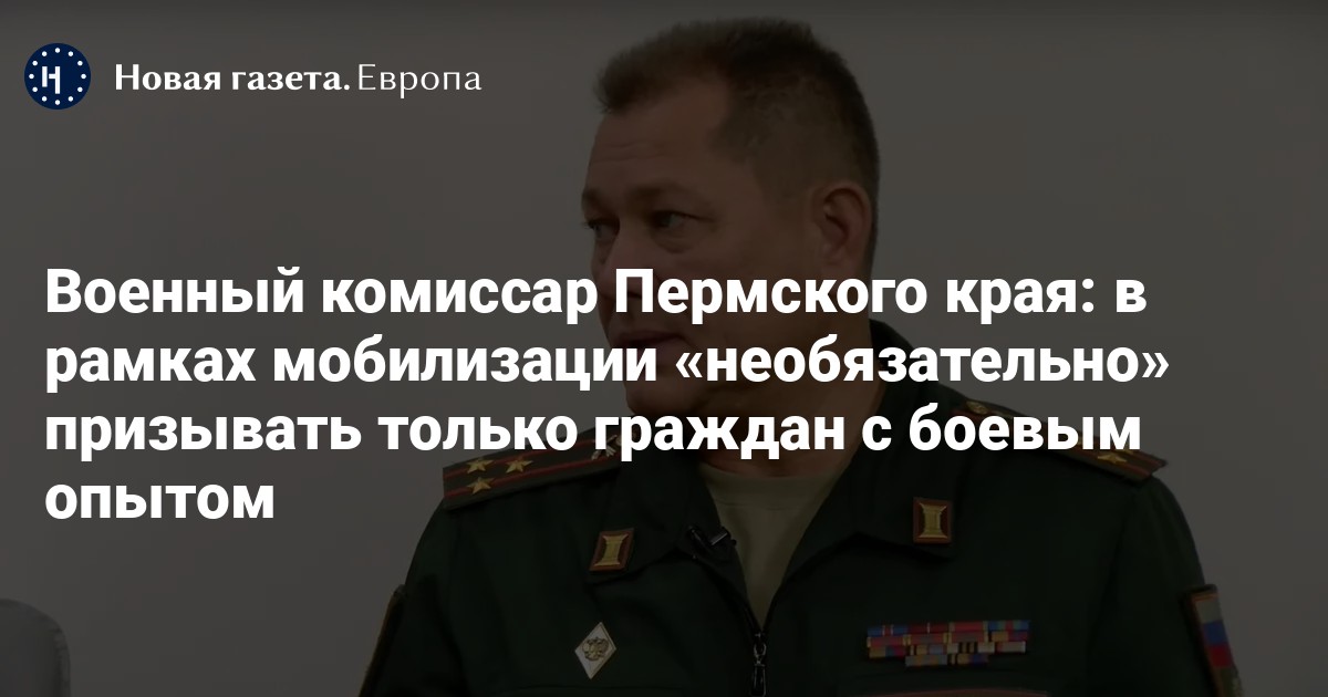 Военный комиссар Пермского края Александр Коковин заявил, что в рамках мобилизации «необязательно» призывать только граждан с боевым опытом. Его интервью опубликовано в группе «Пермский край» во «ВКонтакте».