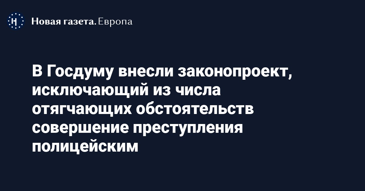 В Госдуму был внесен законопроект, исключающий из числа отягчающих обстоятельств совершение преступления сотрудником полиции. Текст законопроекта опубликован в электронной базе нижней палаты парламента.