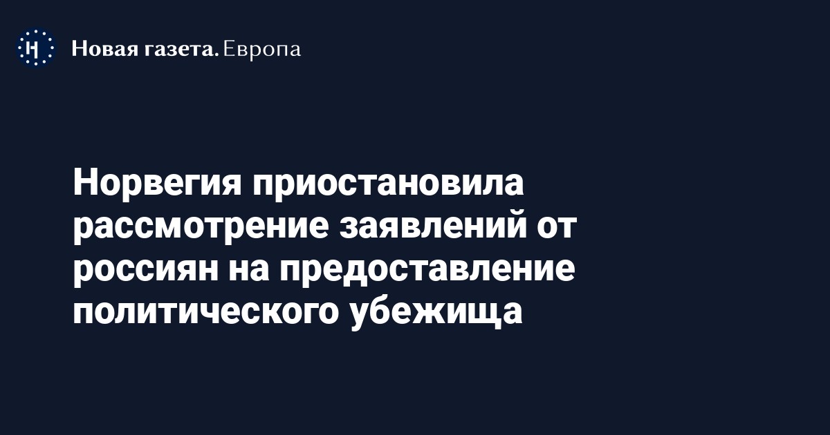 Норвежское иммиграционное управление (UDI) приостановило рассмотрение заявлений от граждан РФ на предоставление политического убежища, сообщает представитель UDI Венче Фоне (ее цитирует телеканал TV 2).