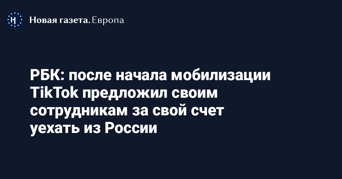 Сотрудникам российского офиса TikTok после начала мобилизации предложили переехать в Казахстан, Армению и Киргизию за свой счет. Об этом сообщает РБК со ссылкой на источники.