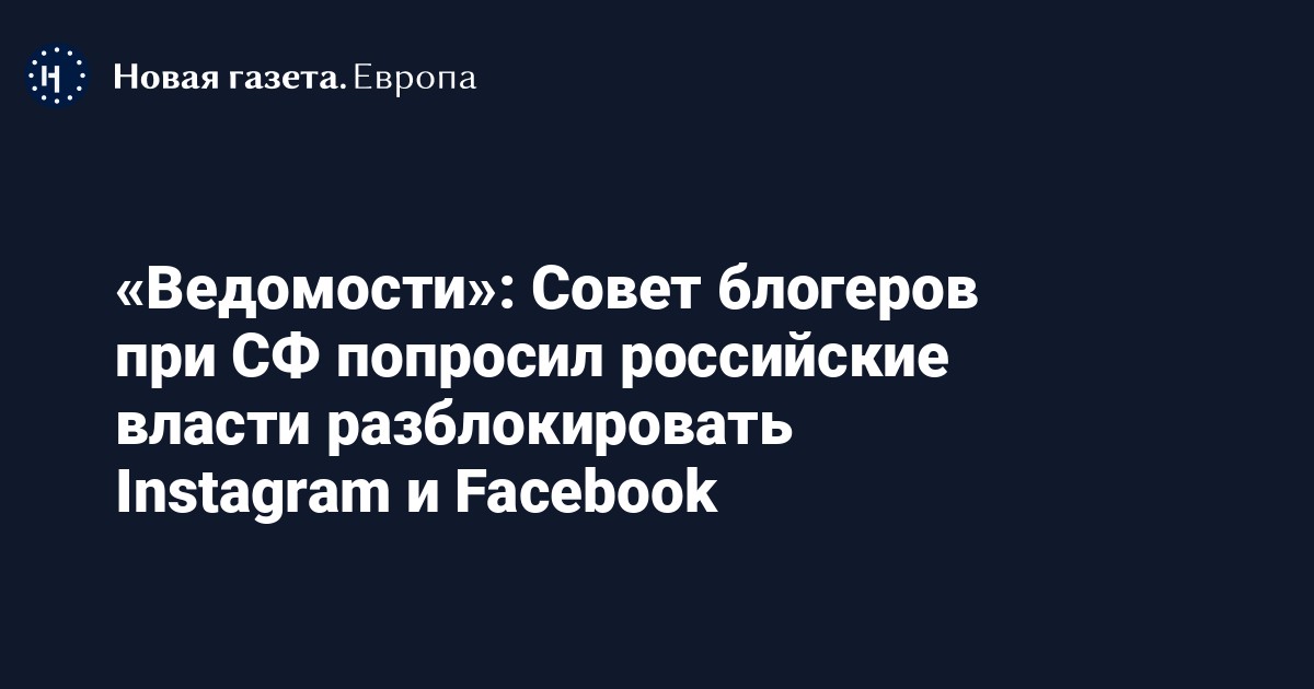 Совет блогеров при Совете Федерации попросил президента РФ Владимира Путина и зампреда Совбеза РФ Дмитрия Медведева разблокировать Instagram и Facebook. Об этом сообщает газета «Ведомости» со ссылкой на копию обращения. Подлинность писем подтвердила координатор совета Валерия Рытвина.