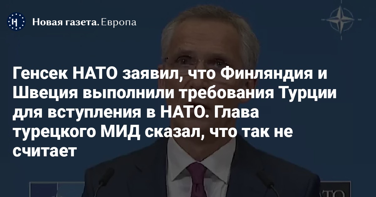 Генеральный секретарь НАТО Йенс Столтенберг заявил, что Финляндия и Швеция выполнили требования Турции для вступления в НАТО, передает ТАСС. По его словам, пришло время принять их в альянс.