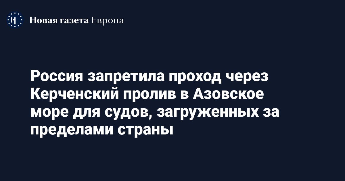 Россия запретила проход судов, загруженных за пределами страны, через Керченский пролив в Азовское море, сообщили ТАСС в Главном управлении по морским делам при Министерстве транспорта и инфраструктуры Турции.