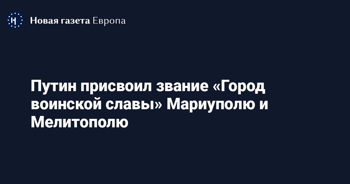 Президент России Владимир Путин поручил присвоить звание «Город воинской славы» оккупированным РФ украинским городам Мелитополю и Мариуполю. Соответствующие указы появились на портале правовой информации.