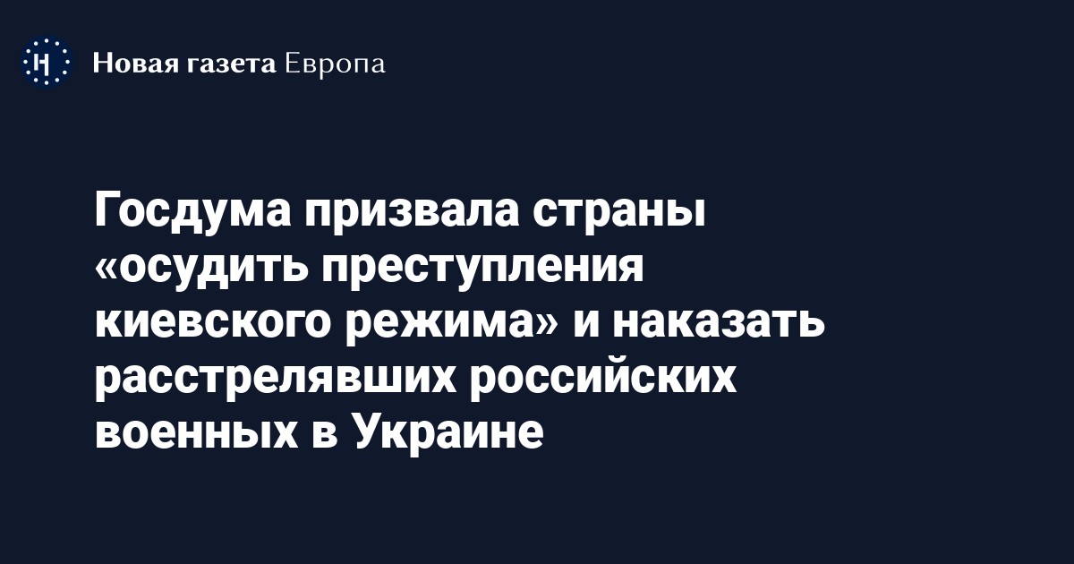 Госдума призвала парламенты стран мира «осудить преступления киевского режима» и содействовать привлечению к ответственности исполнителей убийства российских военных, сдавшихся в плен. Об этом говорится на сайте нижней палаты парламента.