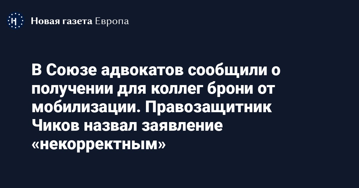 «Адвокат может получить бронь от призыва по мобилизации, к примеру, если он одновременно является преподавателем в ВУЗе, но уже не как адвокат, а именно как сотрудник. Такие случаи известны», — отметил Чиков.