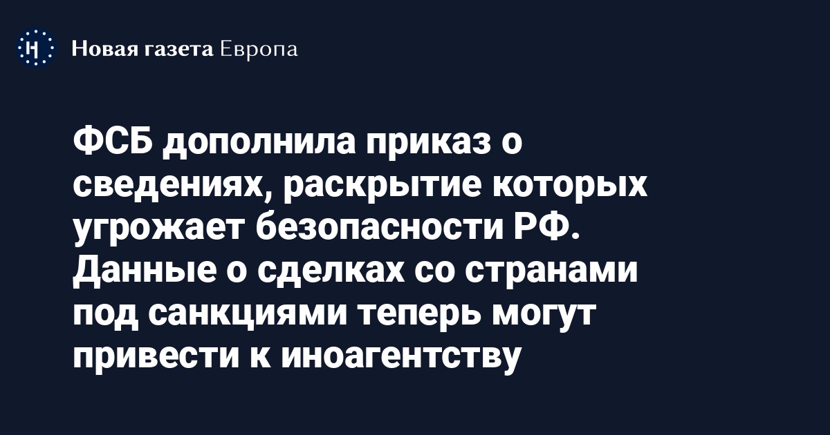 Федеральная служба безопасности (ФСБ) обновила перечень сведений, которые не относятся к гостайне, но получение которых иностранными государствами, иностранными гражданами и международными организациями может быть «использовано против безопасности» России. Новый приказ службы опубликован на официальном портале нормативных актов.