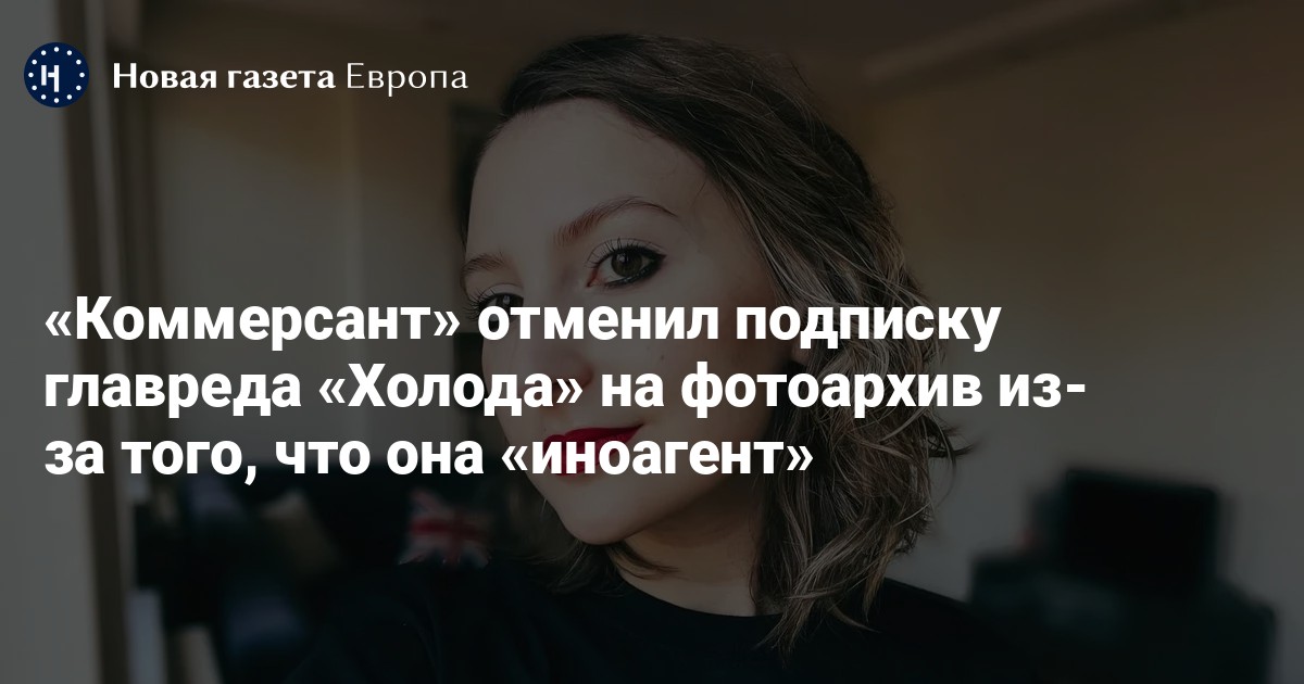 Главный редактор издания «Холод» Таисия Бекбулатова рассказала, что «Коммерсант» отменил ее оплаченную подписку на фотоархив, объяснив это «действующим законодательством РФ в отношении иноагентов».