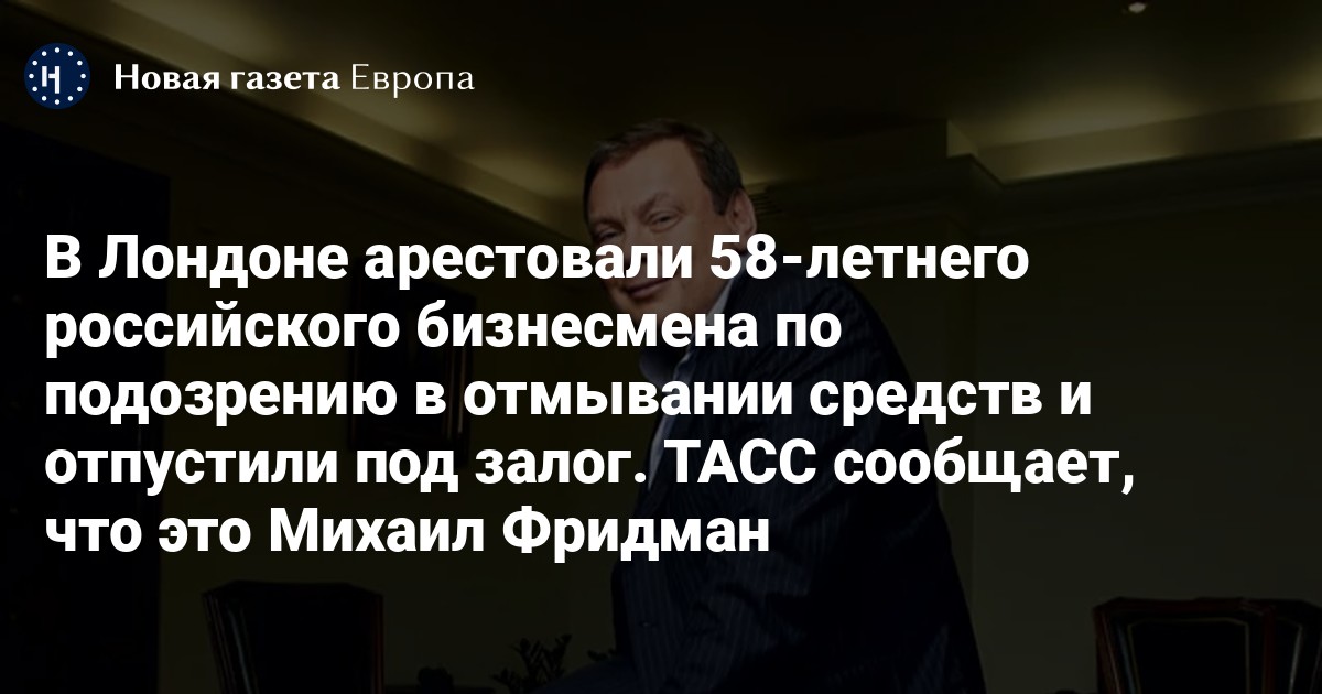 Имена подозреваемых не уточняются. 58-летний мужчина был задержан в своем особняке по подозрению в отмывании денег, сговоре с целью обмана полиции Великобритании и сговоре с целью дачи ложных показаний. ТАСС со ссылкой на источник в окружении бизнесмена сообщает, что это Михаил Фридман.