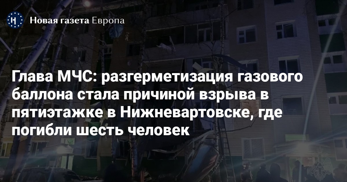 Разгерметизация газового баллона стала причиной взрыва в жилом доме в Нижневартовске, где погибли шесть человек, сообщил глава МЧС России Александр Куренков. В квартире, где произошло ЧП, был не один баллон, добавил он.