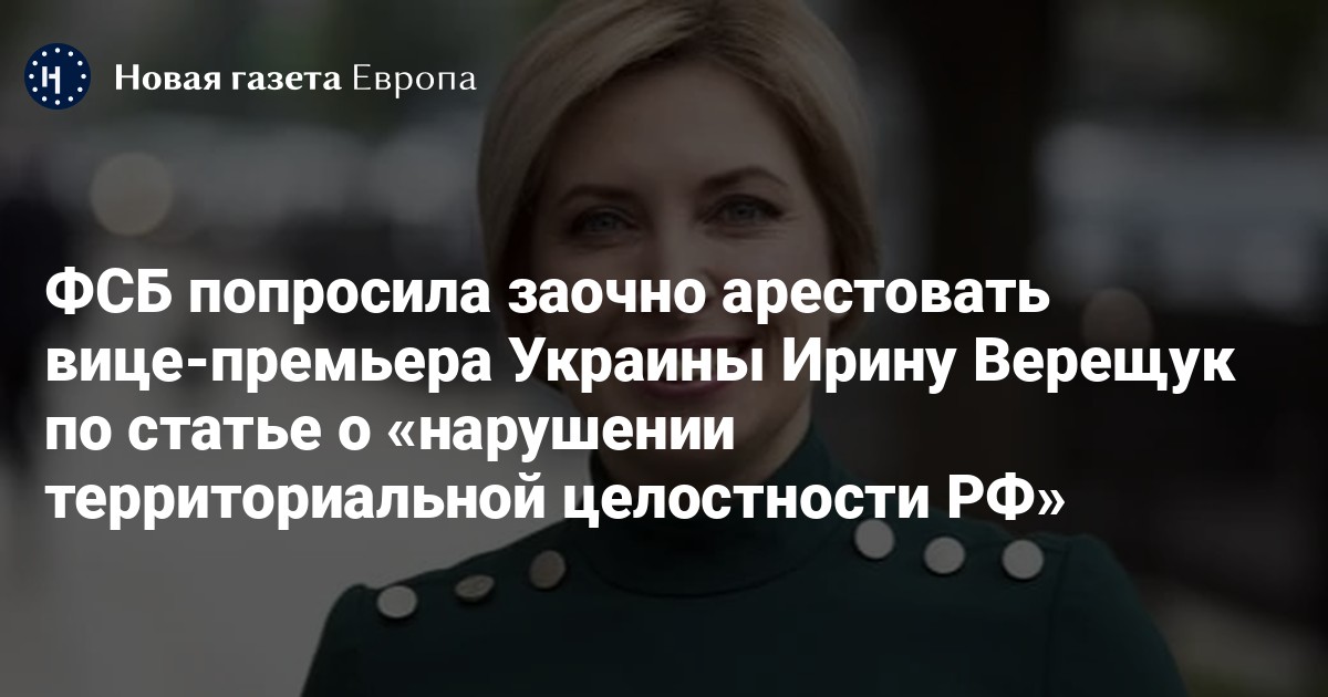 Федеральная службы безопасности (ФСБ) попросила Лефортовский суд Москвы заочно арестовать вице-премьера и министра по вопросам временно оккупированных территорий Украины Ирину Верещук по статье о «нарушении территориальной целостности РФ» (ст. 280.2 УК), следует из данных, опубликованных на сайте московских судов.
