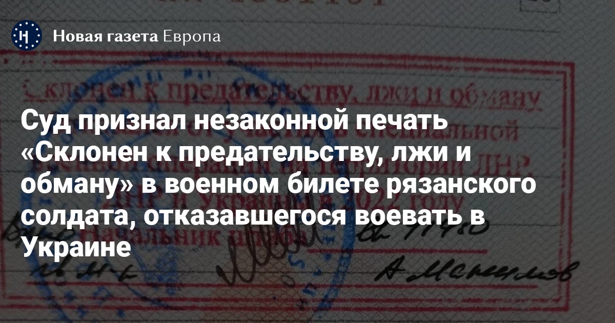 Рядовому после отказа ехать воевать в Украину поставили в военный билет красный штамп: «Склонен к предательству, лжи и обману. Отказался от участия в специальной военной операции на территории ЛНР, ДНР и Украины в 2022 году». Затем его уволили из вооруженных сил.
