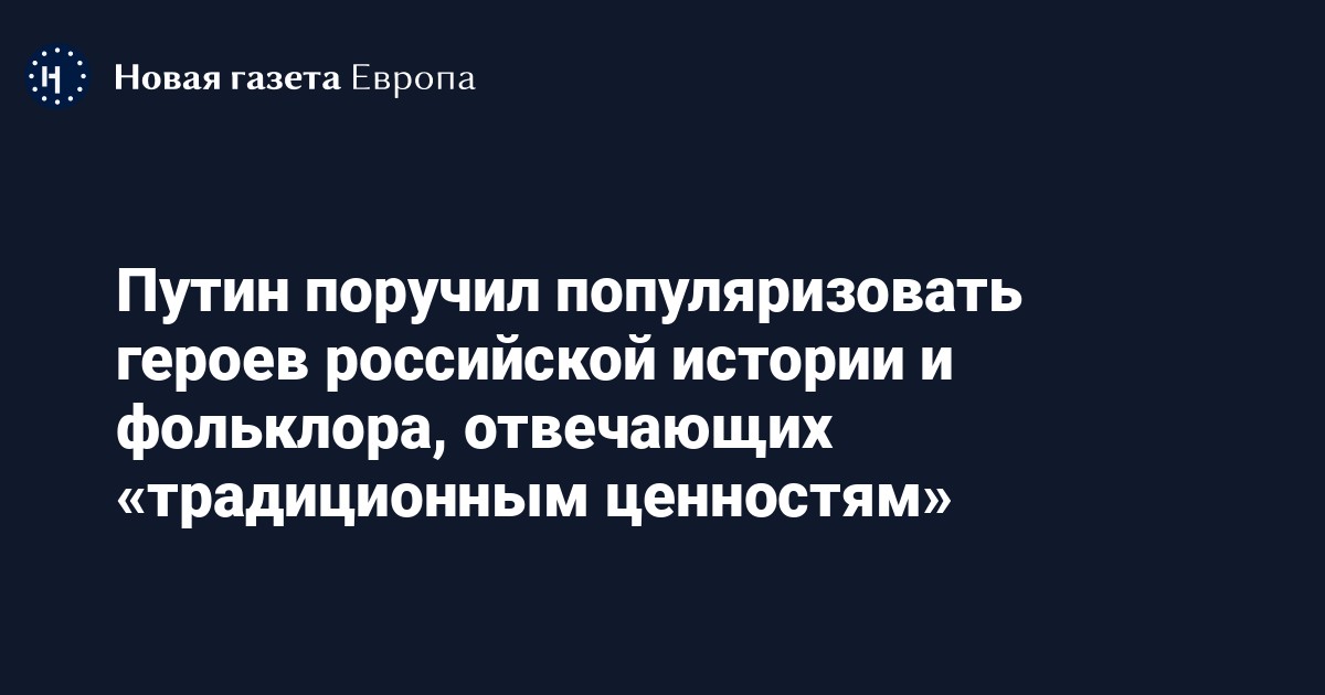 Президент России Владимир Путин поручил правительству страны до 15 мая заняться популяризацией героев российской истории и фольклора, отвечающих «традиционным ценностям». Соответствующий документ опубликован на сайте Кремля.