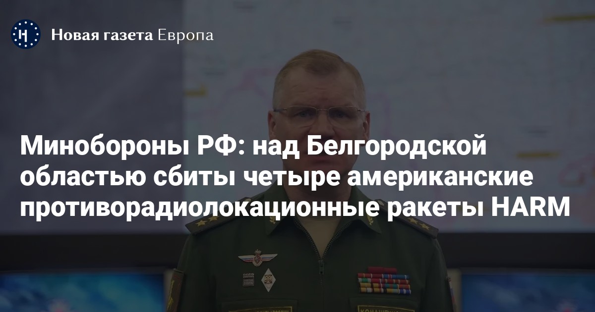 Минобороны России заявило, что над Белгородской областью были сбиты четыре американские противорадиолокационные ракеты HARM. Об этом сообщается в телеграм-канале ведомства.