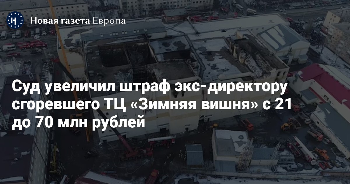 Кемеровский областной суд увеличил штраф бывшему совладельцу и гендиректору сгоревшего ТРЦ «Зимняя вишня» в Кемерове Вячеславу Вишневскому с 21 до 70 млн рублей, передает ТАСС со ссылкой на корреспондента.