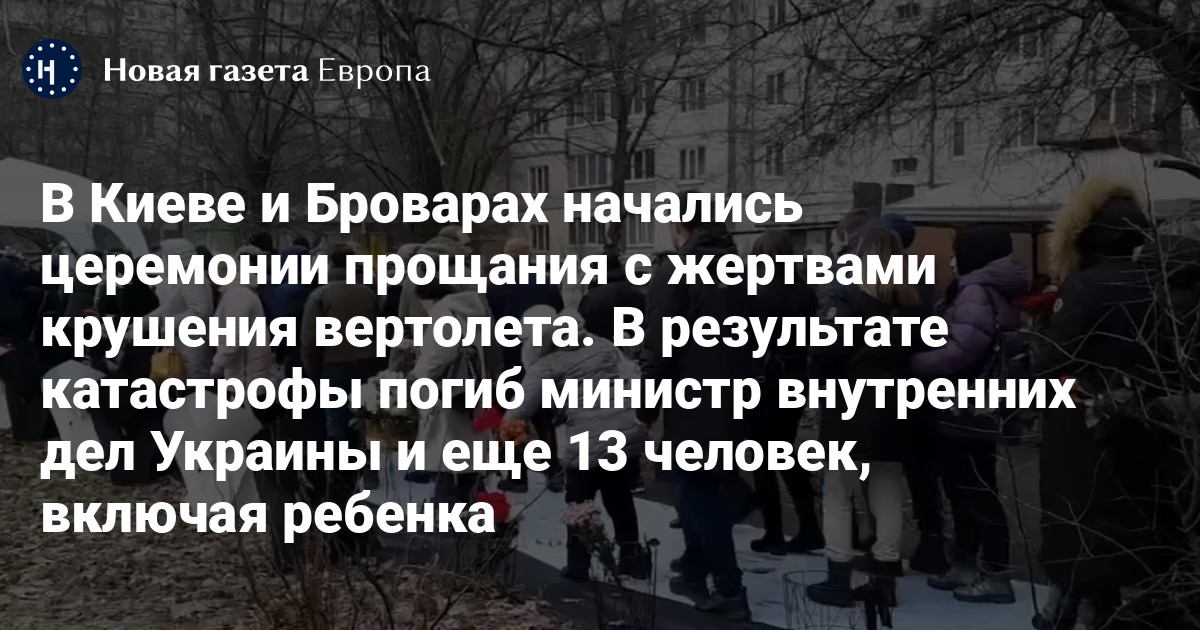 Падении вертолета в районе детского сада в Броварах произошло утром 18 января. В нем находились глава МВД Украины Денис Монастырский, первый заместитель министра МВД Евгений Енин, госсекретарь МВД Юрий Лубкович, помощница главы ведомства Татьяна Шутяк, руководитель охраны министра Михаил Павлушко и фотограф Николай Анацкий. Кроме того, погибли два пилота.