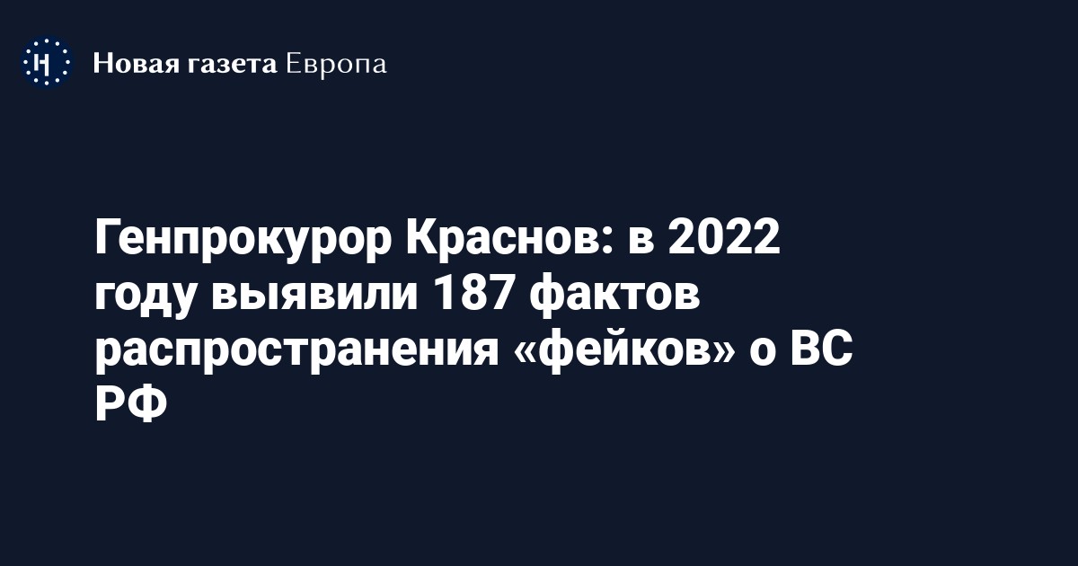 Российский генпрокурор Игорь Краснов сообщил, что за прошлый год было выявлено 187 фактов распространения «фейков» о действиях Вооруженных сил РФ (ст. 207.3 УК). Об этом он сказал в интервью «Известиям».