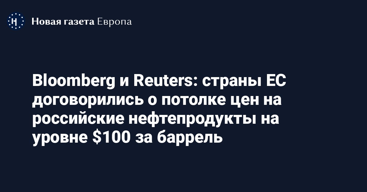 Cтраны Евросоюза договорились о потолке цен на российские нефтепродукты на уровне $100 за баррель. Об этом сообщают Bloomberg и Reuters со ссылкой на источники.