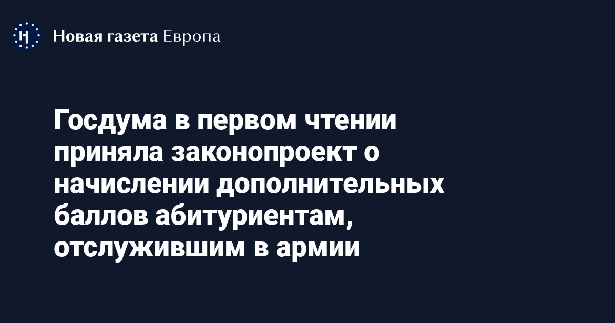 Государственная дума в первом чтении приняла законопроект, который предполагает начисление дополнительных баллов абитуриентам вузов, отслужившим в армии. Об этом сообщается на портале обеспечения законодательной деятельности.