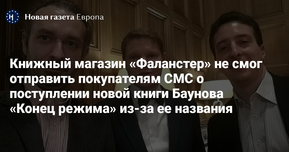 Книжный магазин «Фаланстер» не смог оповестить покупателей по СМС о новой книге Александра Баунова «Конец режима: Как закончились три европейские диктатуры». Рассылка прошла, только когда убрали название, рассказал один из основателей книжного магазина «Фаланстер» Борис Куприянов на своей странице в фейсбуке.