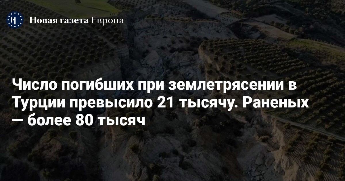 Число погибших при землетрясении в Турции достигло 21 043, раненых — 80 097, сообщил президент Турции Реджеп Тайип Эрдоган.