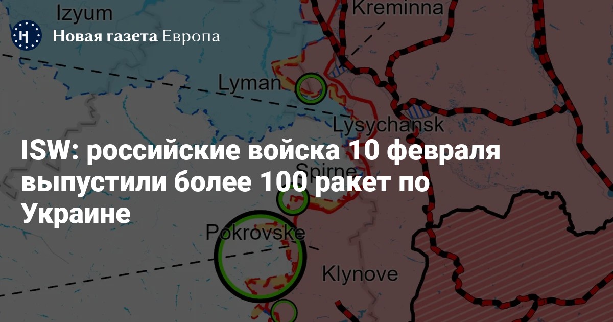 Российские силы 10 февраля нанесли еще одну массированную серию ракетных ударов по территории Украины и выпустили более 100 ракет по критически важной и гражданской инфраструктуре, сообщает американский Институт изучения войны (ISW) в своей ежедневной сводке.