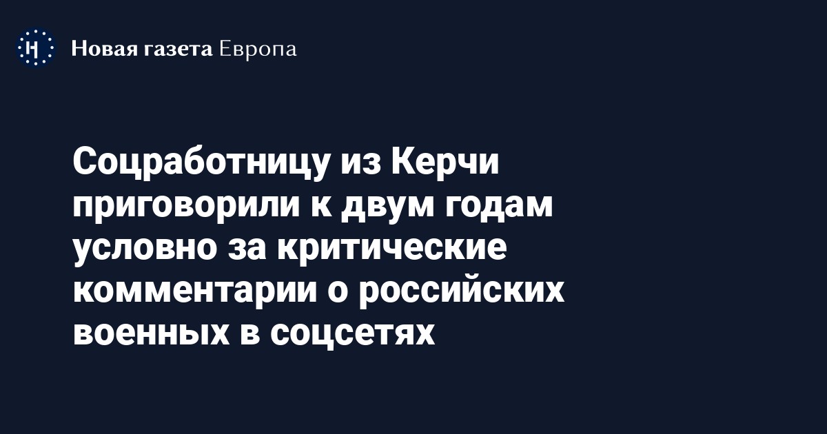 Керченский городской суд приговорил к двум годам условно социальную работницу Ольгу Саенко по делу о призывах к экстремизму в интернете (ч. 2 ст. 280 УК), сообщает пресс-служба суда. Информация о приговоре, как отмечает «ОВД-Инфо», также есть в карточке дела.