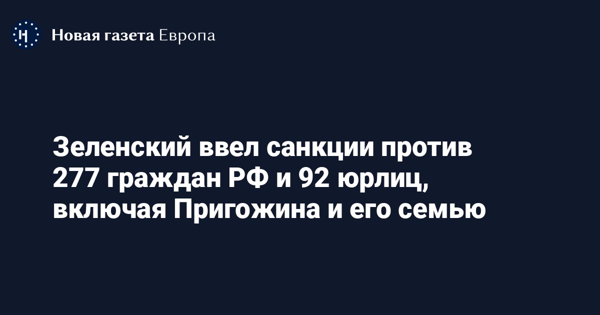 Президент Украины Владимир Зеленский ввел санкции против 277 граждан РФ и 92 юрлиц, включая основателя ЧВК «Вагнер» Евгения Пригожина и его семью, легкоатлетку Елену Исинбаеву и председателя правительства Чечни Муслима Хучиева. Соответствующий указ опубликован на сайте офиса украинского президента.
