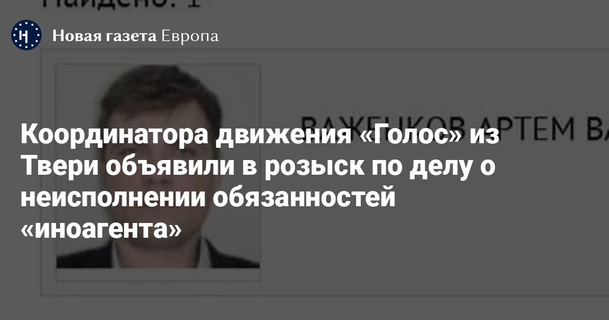 Следственный комитет объявил в розыск координатора движения «Голос» из Твери и ведущего ютуб-канала Avtozak LIVE Артема Важенкова по делу о нарушении порядка деятельности «иностранного агента» (ч. 2 ст. 330.1 УК), сообщает глава «Агоры» Павел Чиков в телеграм-канале.