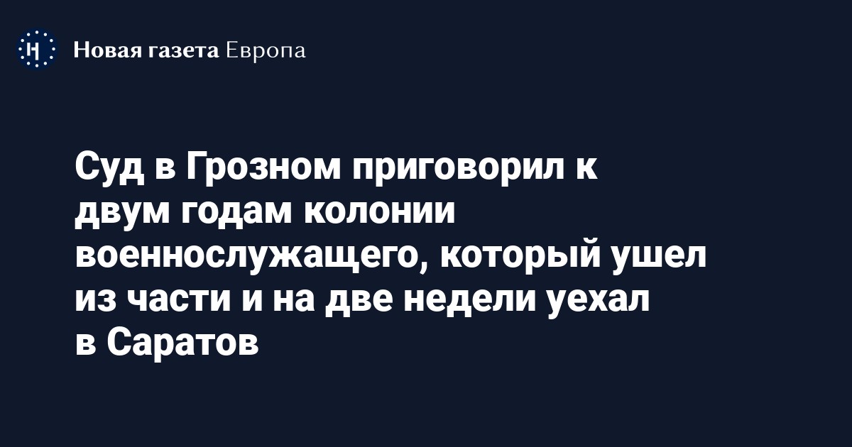 Грозненский гарнизонный военный суд приговорил к двум годам лишения свободы в колонии общего режима военнослужащего Евгения Еремина, который ушел из части и уехал в Саратов. На приговор, опубликованный на сайте суда, обратил внимание «Кавказский узел».