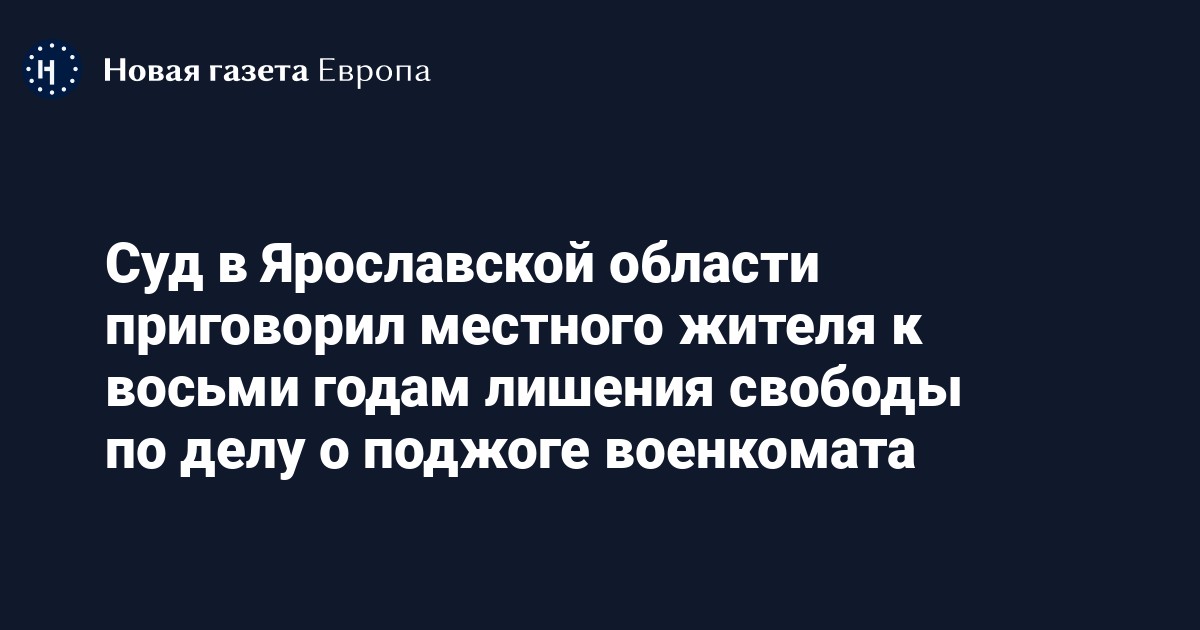 2-й Западный окружной военный суд приговорил жителя Углича Дениса Попова к восьми годам лишения свободы по делу о попытке поджечь военкомат. Об этом сообщает «Коммерсант» со ссылкой на пресс-службу УФСБ по региону.