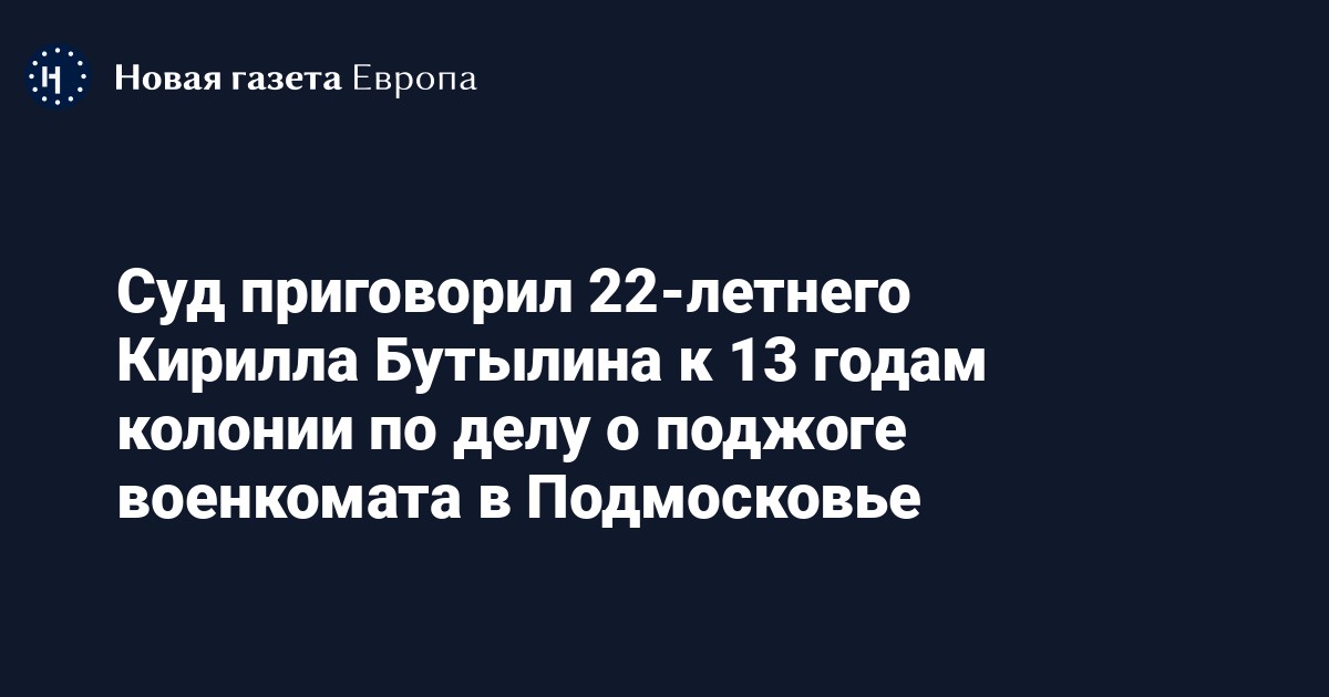 Прокурор во время прений во Втором Западном окружном военном суде попросил приговорить 22-летнего Кирилла Бутылина к 13 годам колонии строгого режима по делу о поджоге военкомата в подмосковных Луховицах, сообщает ТАСС со ссылкой на корреспондента.