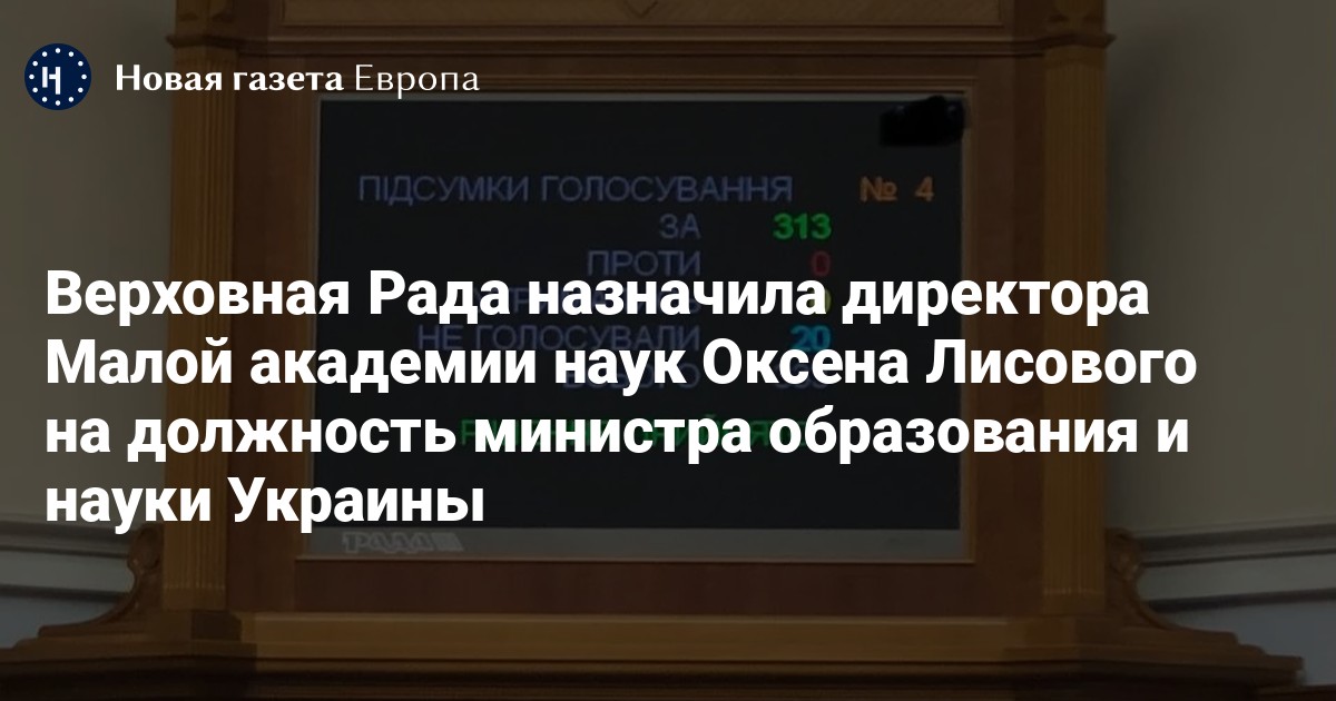 Верховная Рада назначила директора Малой академии наук Оксена Лисового на должность министра образования и науки Украины, сообщил депутат Ярослав Железняк. По его словам, соответствующее решение поддержали 313 народных депутатов.