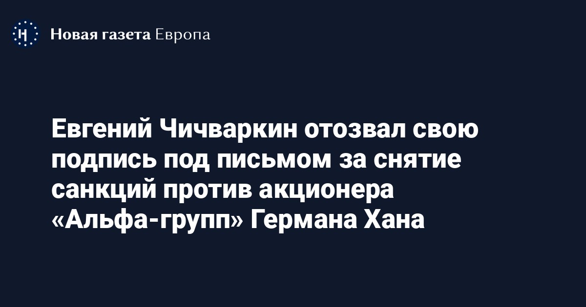 Бизнесмен Евгений Чичваркин отозвал свою подпись под письмом в Еврокомиссию за снятие санкций против акционера «Альфа-групп» Германа Хана. Об этом он заявил в эфире «Ходорковский Live».