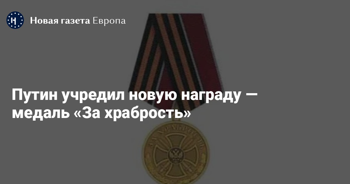 Президент РФ Владимир Путин учредил новую награду — медаль «За храбрость», следует из указа, опубликованного на портале правовых актов.