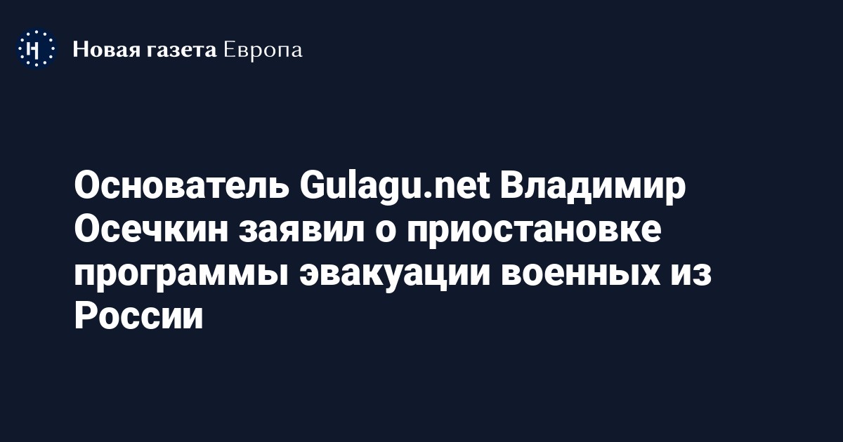 Проект Gulagu.net временно приостанавливает программу содействия в эвакуации из России раскаявшихся военнослужащих и силовиков. Об этом сообщил глава проекта Владимир Осечкин.