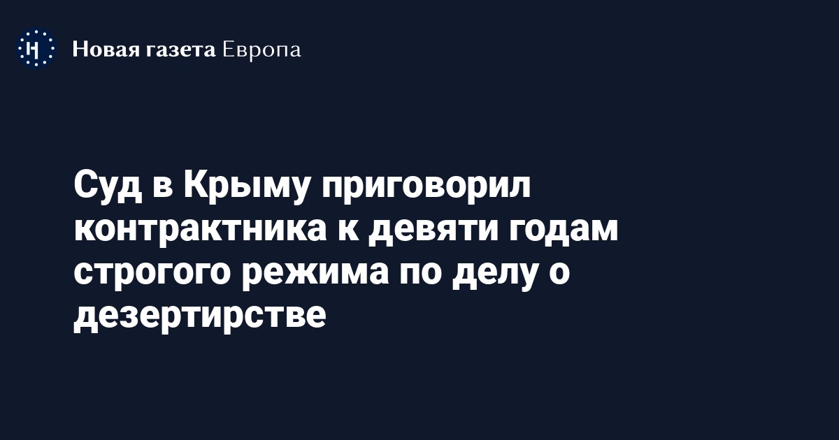 Крымский гарнизонный военный суд приговорил контрактника к девяти годам лишения свободы в колонии строгого режима по делу о дезертирстве (ч. 3 ст. 338 УК), сообщает пресс-служба суда.