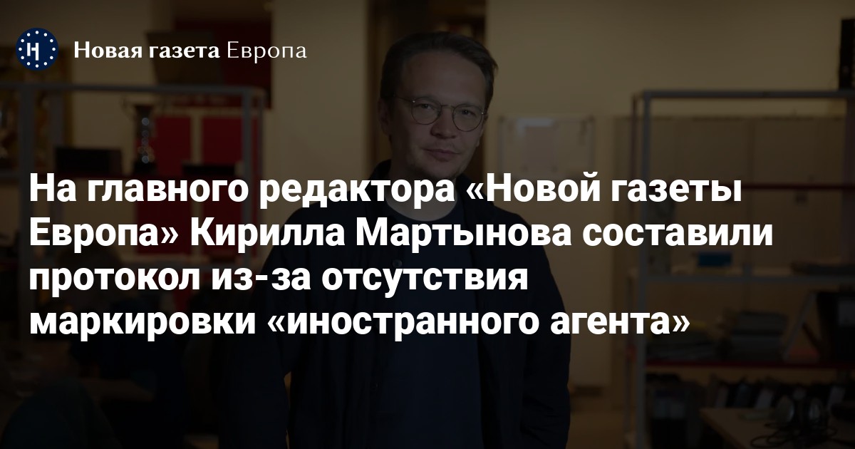 На главного редактора «Новой газеты Европа» Кирилла Мартынова составили протокол из‑за отсутствия маркировки «иностранного агента». Внимание на это обратила «Медиазона».