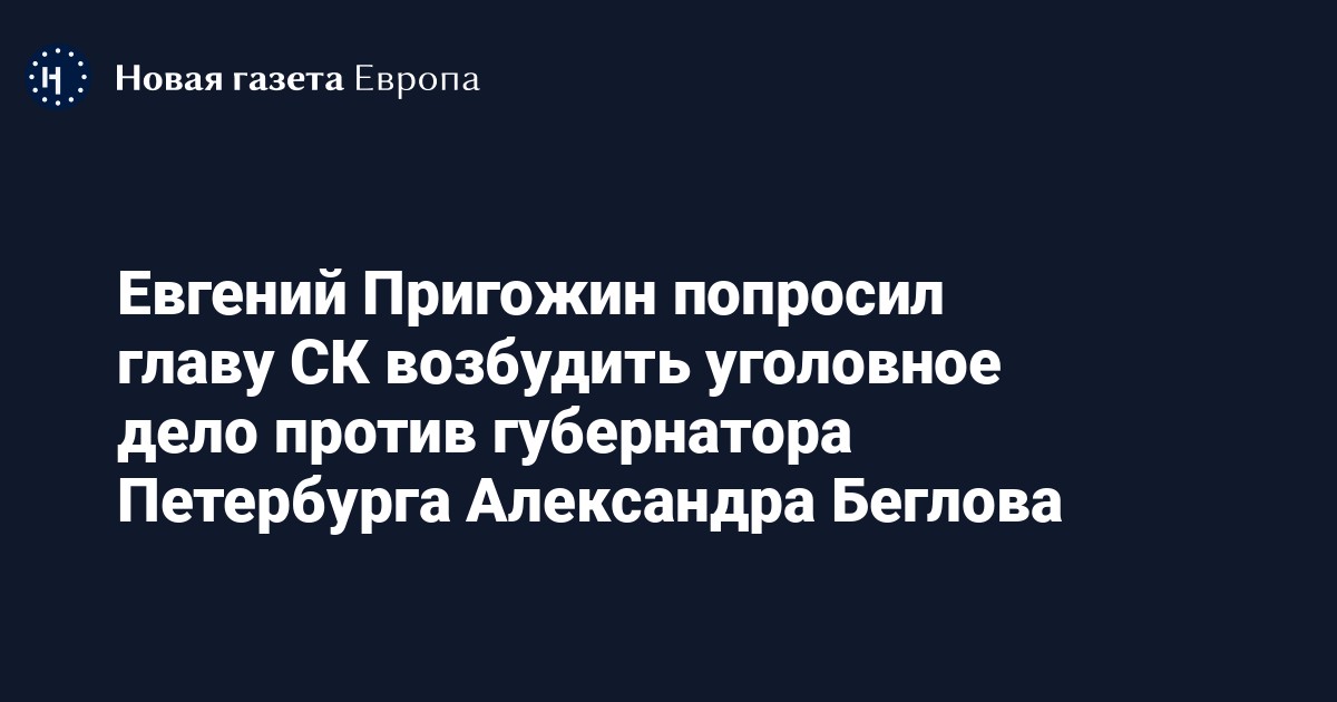Основатель ЧВК «Вагнер» Евгений Пригожин обратился к председателю Следственного комитета России Александру Бастрыкину с просьбой возбудить уголовное дело против губернатора Санкт-Петербурга Александра Беглова. Об этом сообщает пресс-служба Пригожина.