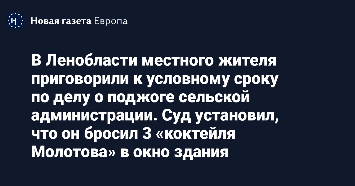В Ленобласти местного жителя приговорили к условному сроку по делу о поджоге сельской администрации. Суд установил, что он бросил 3 «коктейля Молотова» в окно здания
